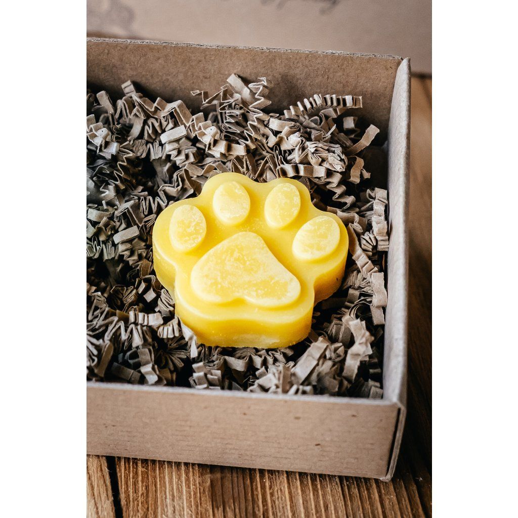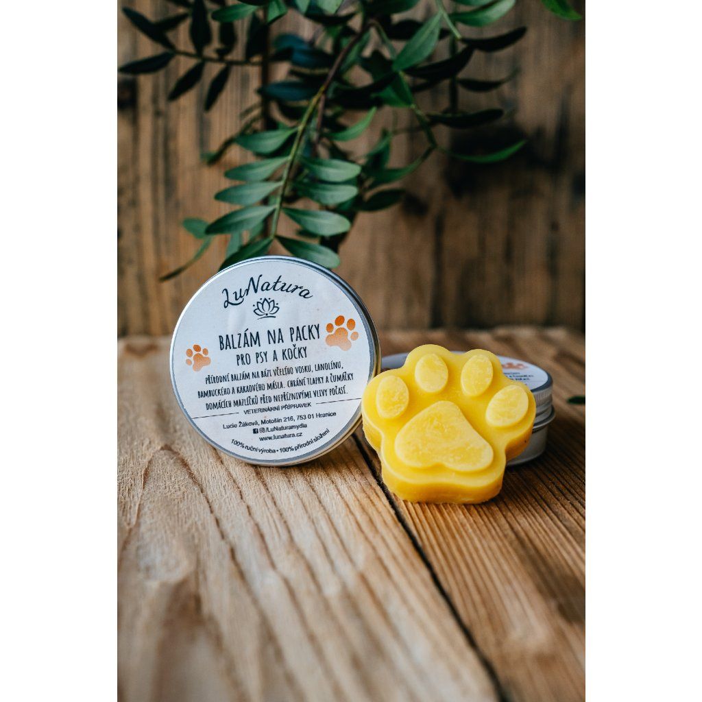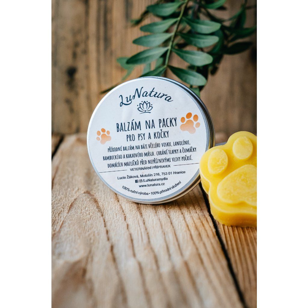 Balzám je na bázi včelího vosku, kakaového, bambuckého másla a lanolínu. Obsahuje úžasné přírodní složky, které se postarají o zvláčnění suchých paciček a čumáčků. Ochrání je před nepříznivými vlivy počasí a zregeneruje již popraskané nebo jinak poškozené tlapky.
