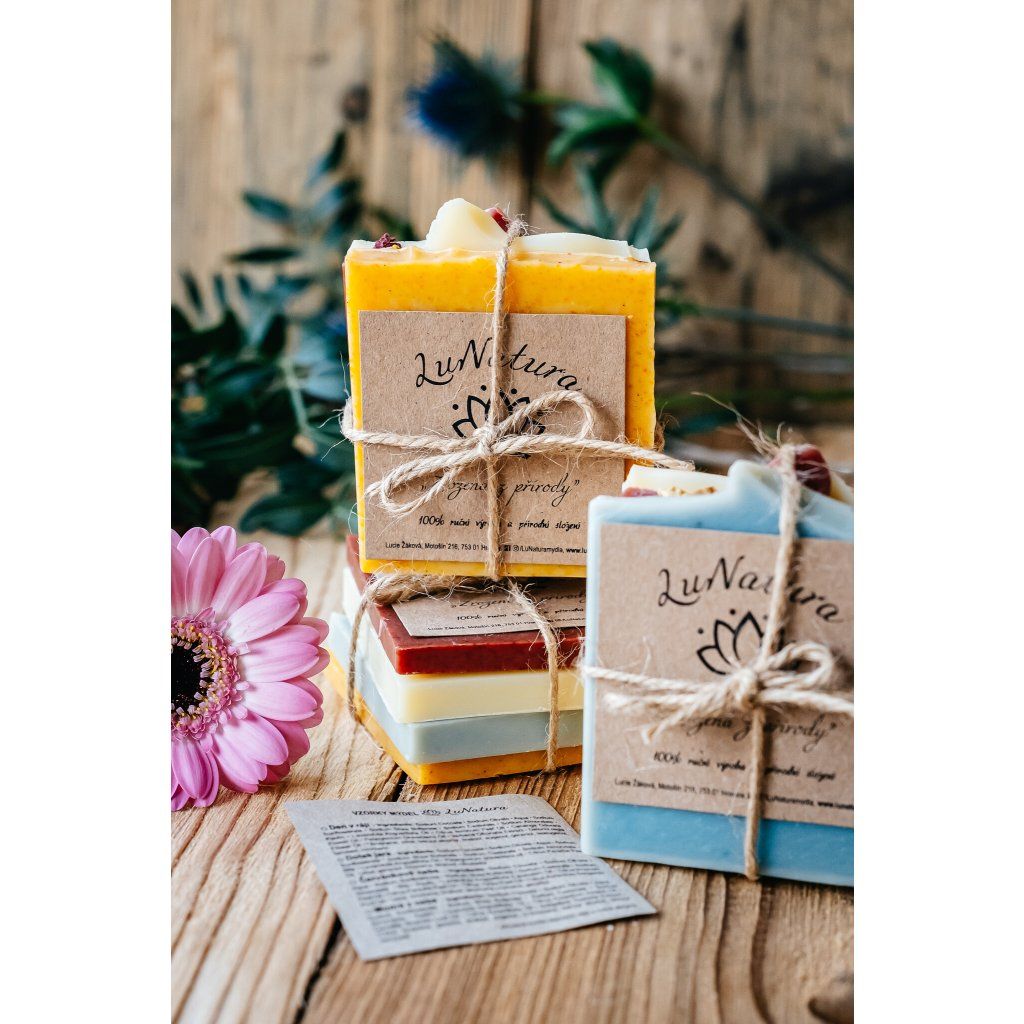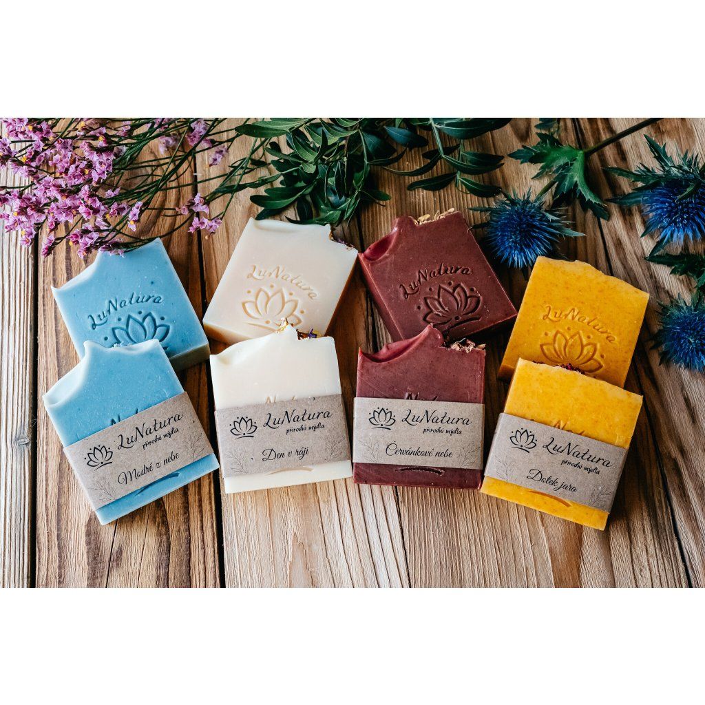 Modré z nebe - intenzivní mýdlo s vůní neroli, bílý čaj, levandule, limeta a citrón. Barveno je modrým jílem a indigem a obsahuje kokosový olej, bambucké máslo, olivový a mandlový olej.